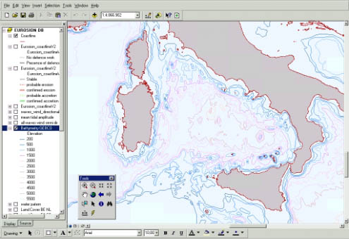 | Bathymetry of the Tyrrhenian Sea and surroundings. The first contour line available is 200 m, which restricts this product to low resolution applications (e.g. calculation of surge level) but not for local applications (e.g. modelling of long-shore currents) |